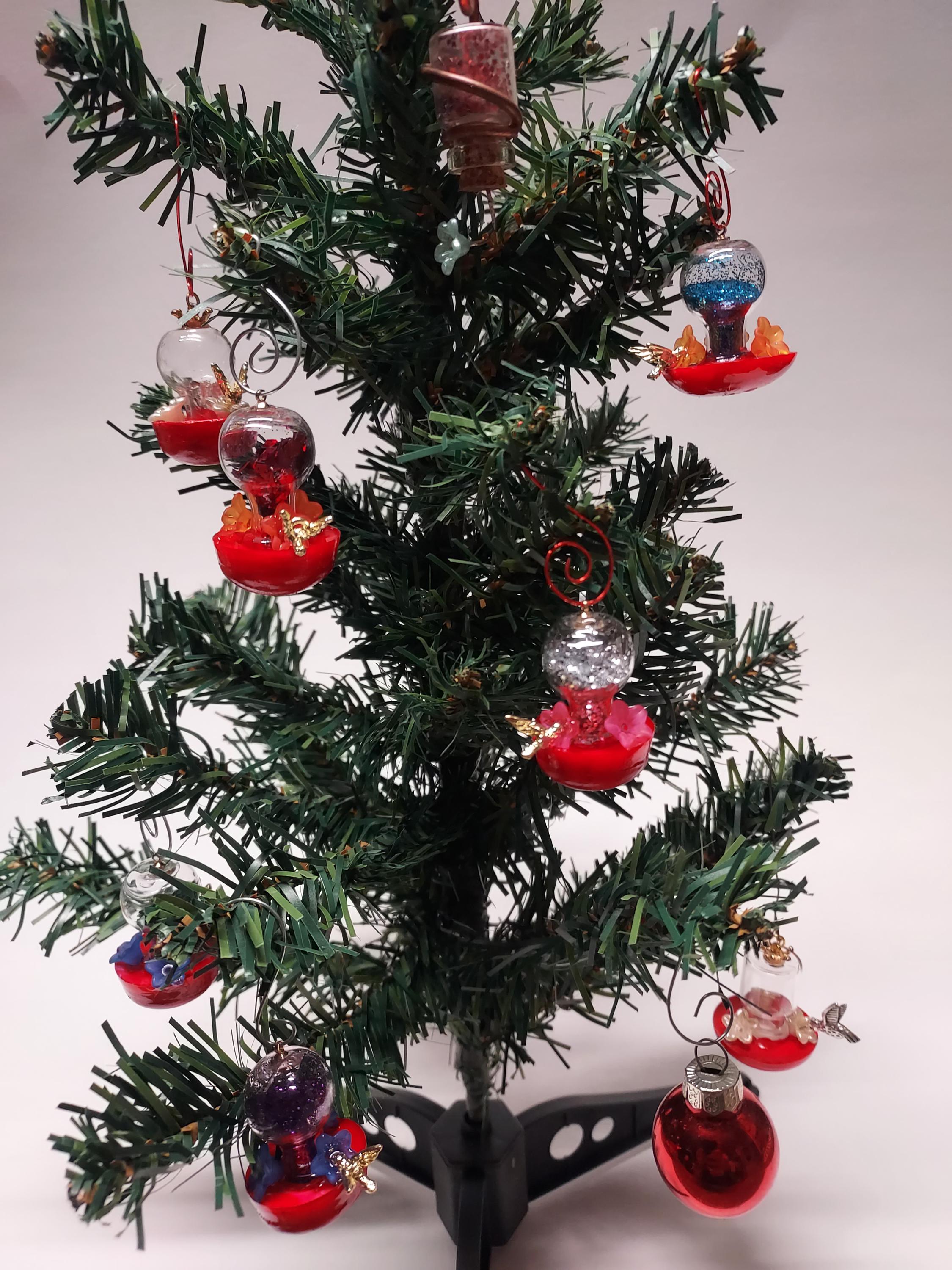 This is a 100% handmade ornament for a Christmas tree or a mini garden. This miniature hummingbird feeder is approximately 1 1/4 inches tall and 1/2 to 3/4 inch wide.